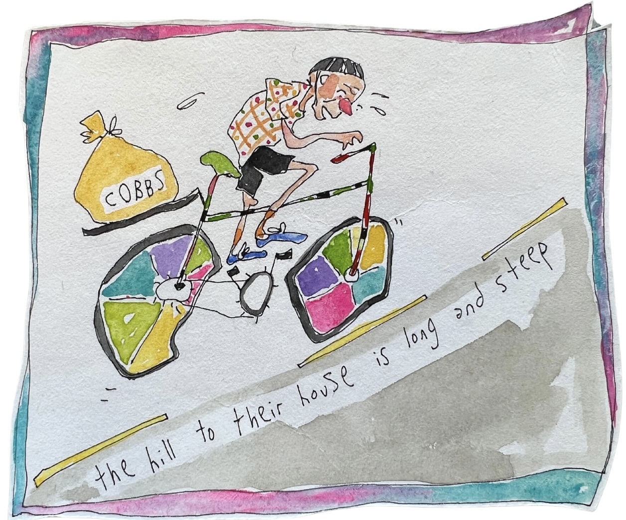 Jim’s version goes like this. He says as a kid he would play soccer barefoot as they had no money for soccer boots. He always liked sports but did not focus on getting into shape until age 45 when he hurt his back and had to crawl to the bathroom for six weeks. His doctor set him up with a physio who gave him exercises which he did every day as he was determined to get his life back. Since then he says he swims and bikes everyday to keep active. He also goes to Cobs Bread and buys treats and rides them up the hill to Michelle’s house. I would like to have a Jim near me.