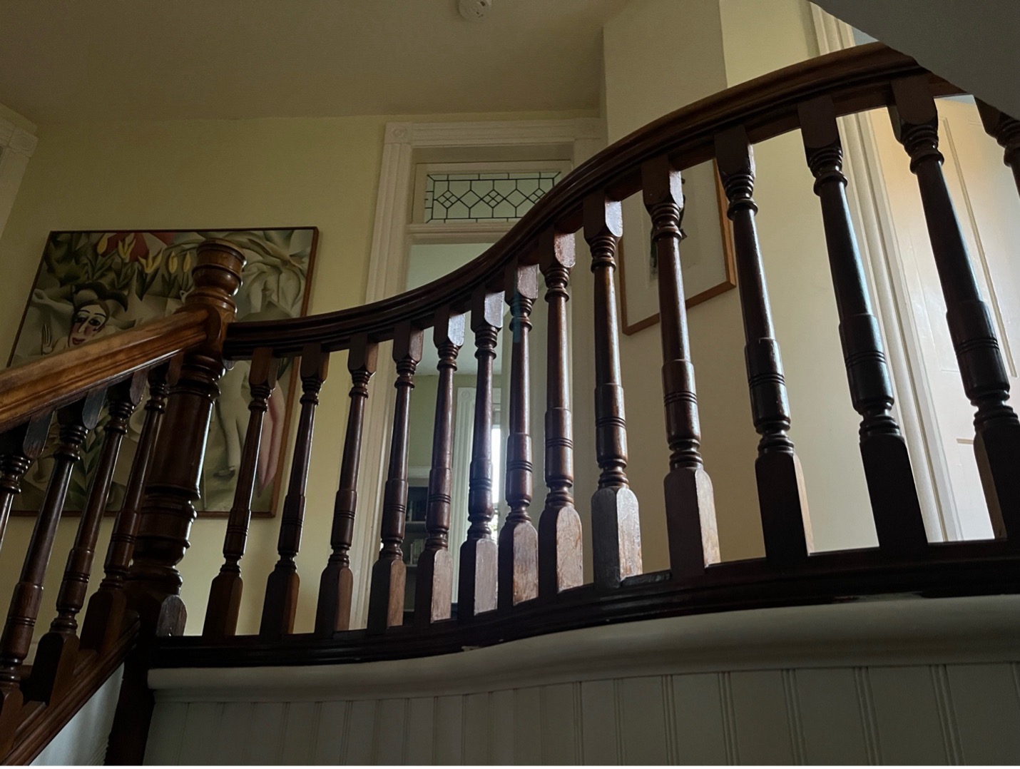 - There is a balustrade that curves going up the stairs, and I like curving wood structures