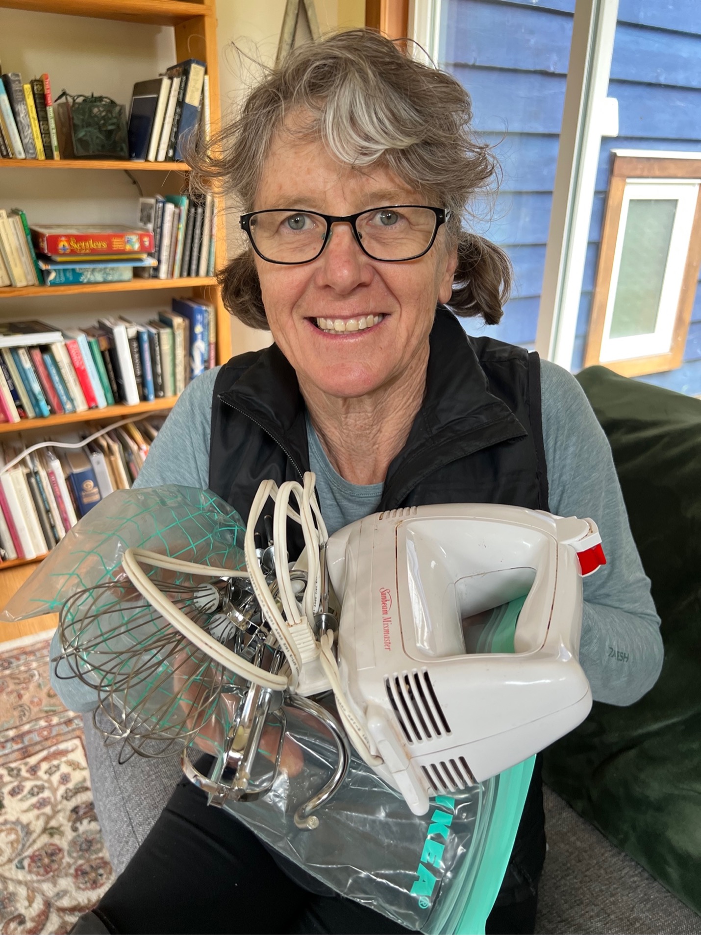 OK, now I want to add one other thing to my bike ride, it is a little illegal as it is not ON my road. I work about a 3 minute bike ride from my road. I am on the gov’t wharf and on the wharf is a bench where boaters put things that they no longer want. Just look at what I found on the bench today! It was all packaged up in a brand new zip lock and it is exactly what I had been telling Lizzie that I needed. My mixer does not have different speeds, just go and stop. This one has a lot of speeds and it has many attachments. I am very excited to try it. I am hoping my cakes might turn out a bit like my neighbour's with this new appliance. And for those of you who are worried, I did clean it. I went over it with a toothbrush and got out all the little bits stuck in the grooves. If I die in the next few days though, you will all know that it came from something scary stuck to the new beaters.