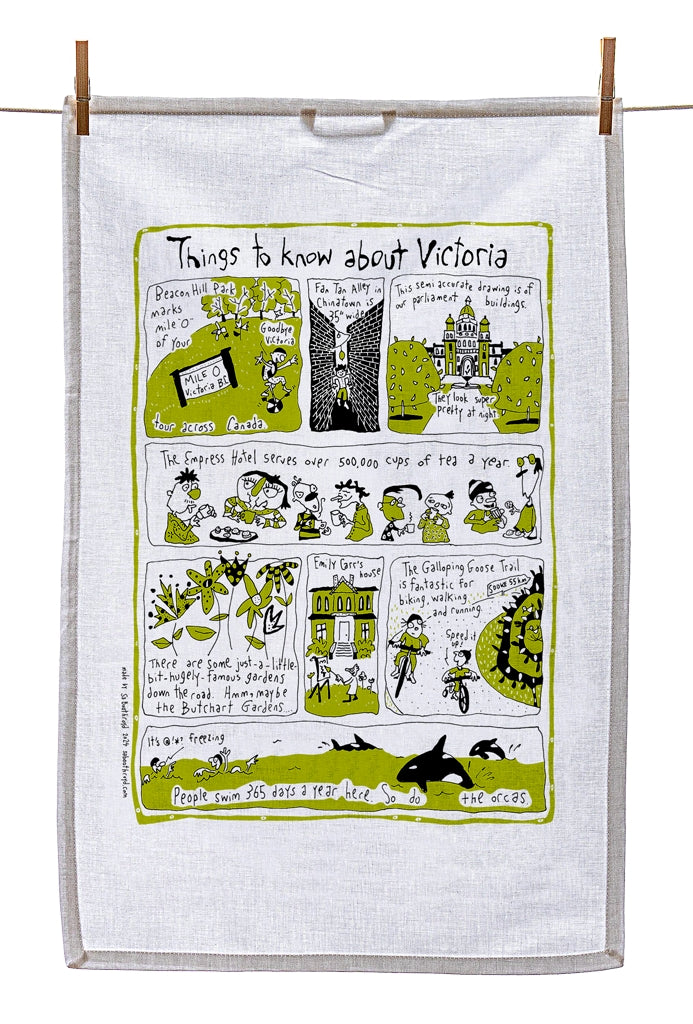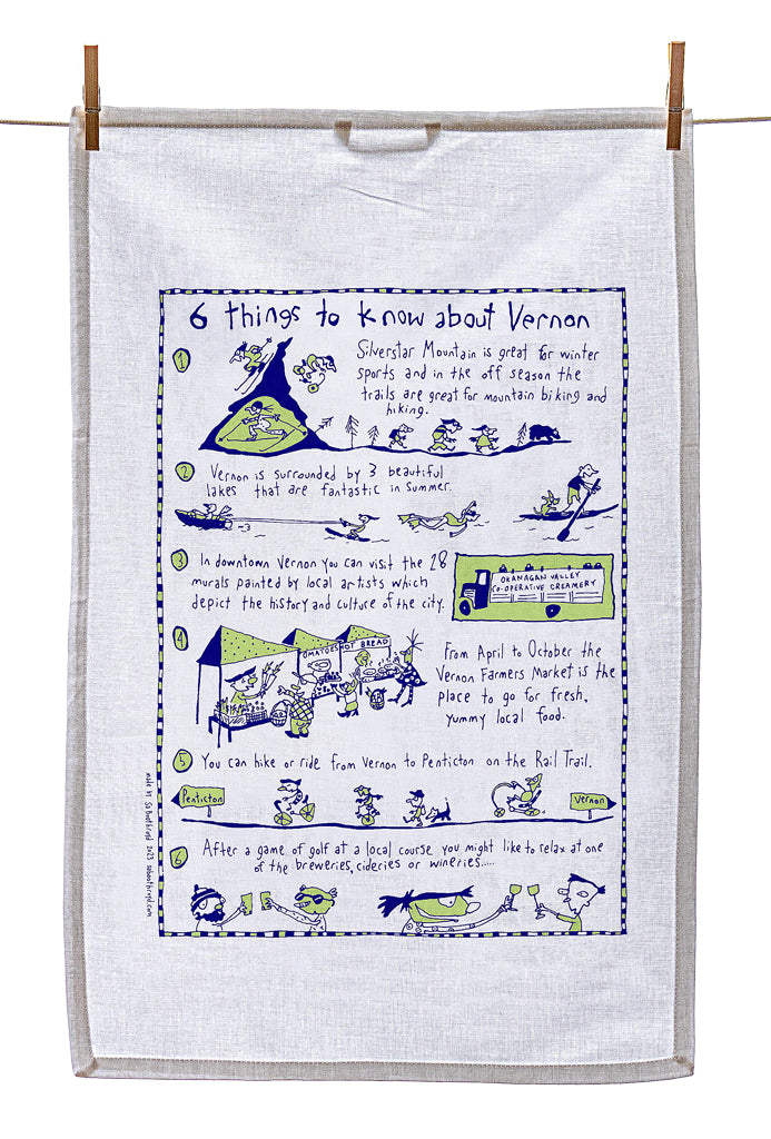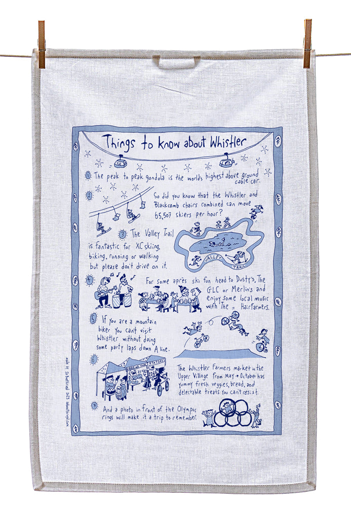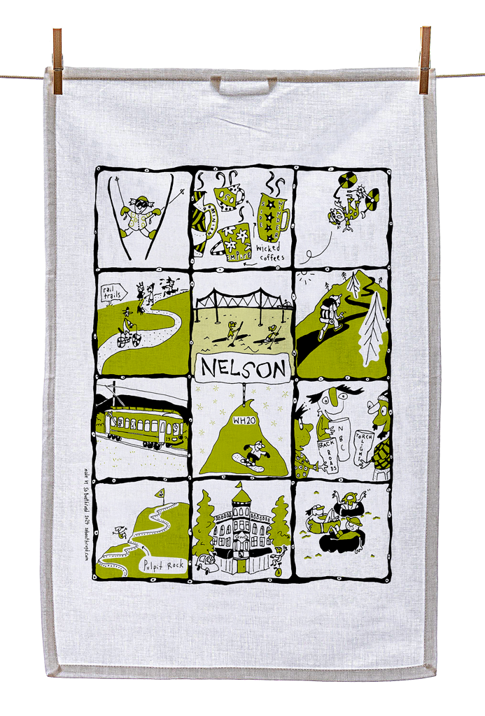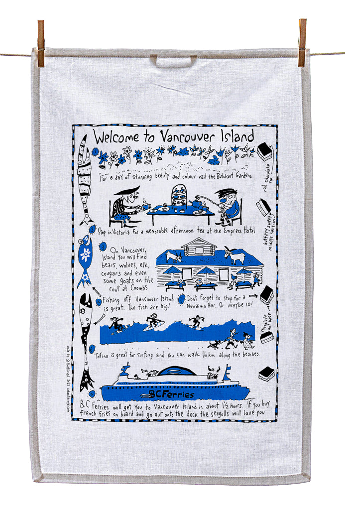 Our silk screened tea towels are made by a team of elves here in Gibsons, BC. You can use them to dry your dishes, swat a fly, hang on the wall as artwork or you may want to use it to cover your body while running from the bathroom to the bedroom after a shower.