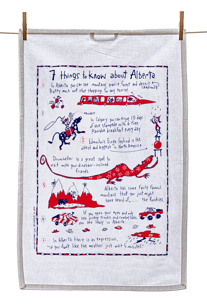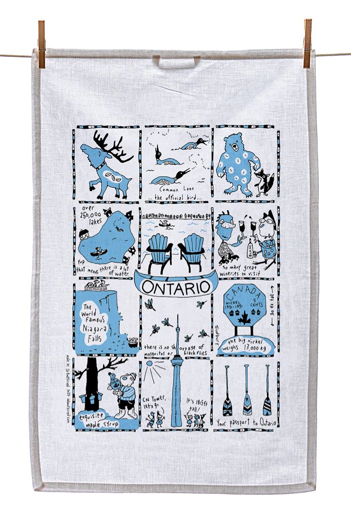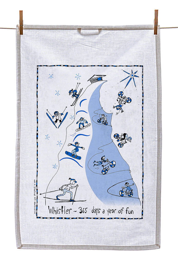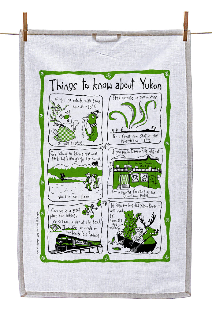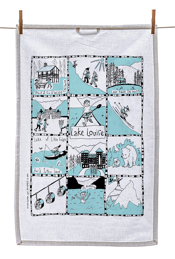 Our silk screened tea towels are made by a team of elves here in Gibsons, BC. You can use them to dry your dishes, swat a fly, hang on the wall as artwork or you may want to use it to cover your body while running from the bathroom to the bedroom after a shower.